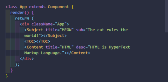 App 컴포넌트의 하위 컴포넌트인 Subject 컴포넌트에서 하드 코딩되어있는 props(속성) 부분을 state로 표현해보자. 지금은 밑의 사진처럼 Subject 컴포넌트에 직접 내용이 들어가 있는 하드 코딩 방식이다.