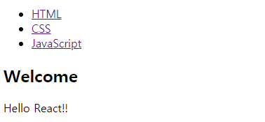우리가 하고자 하는 건, a 태그 링크를 클릭했을 때 Content 컴포넌트 영역에 Welcome 문구가 뜨게하는 특정 자바 스크립트 코드가 실행되게 하는 것이다. 우린 이 기능을 onClick 함수를 이용해 구현할 수 있다. a 태그의 링크를 클릭했을 때 onClick 안의 함수가 실행되도록 코드를 작성하자.