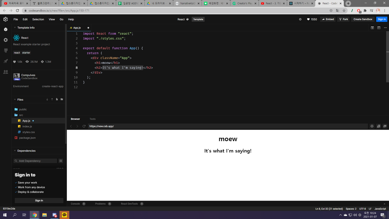 리액트 공식 홈페이지에서 Get Started 버튼을 누르면 리액트를 체험해볼 수 있다. Online Playgrounds - CodeSandbox의 경우 온라인으로 리액트 애플리케이션을 구현해볼 수 있다.