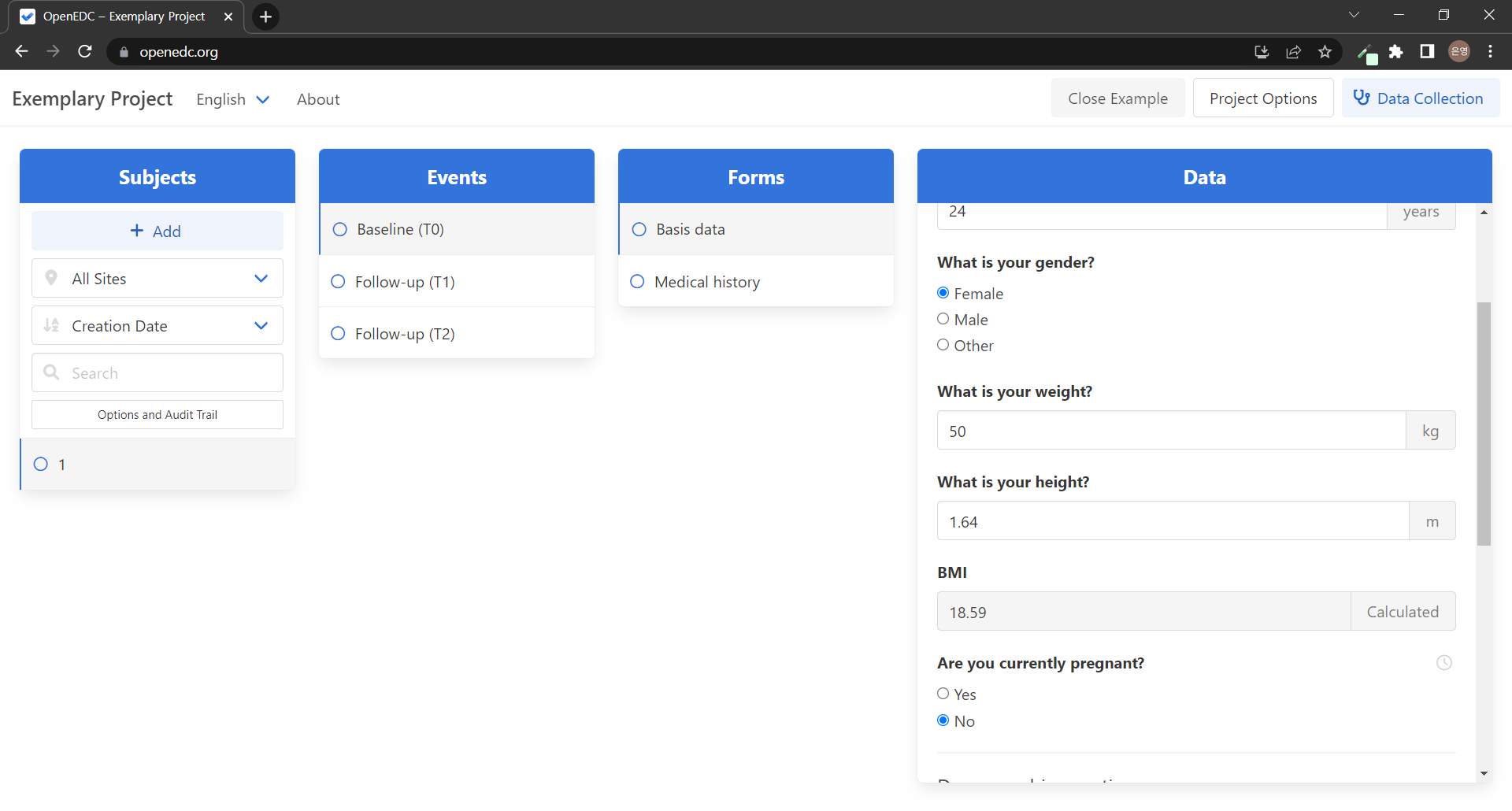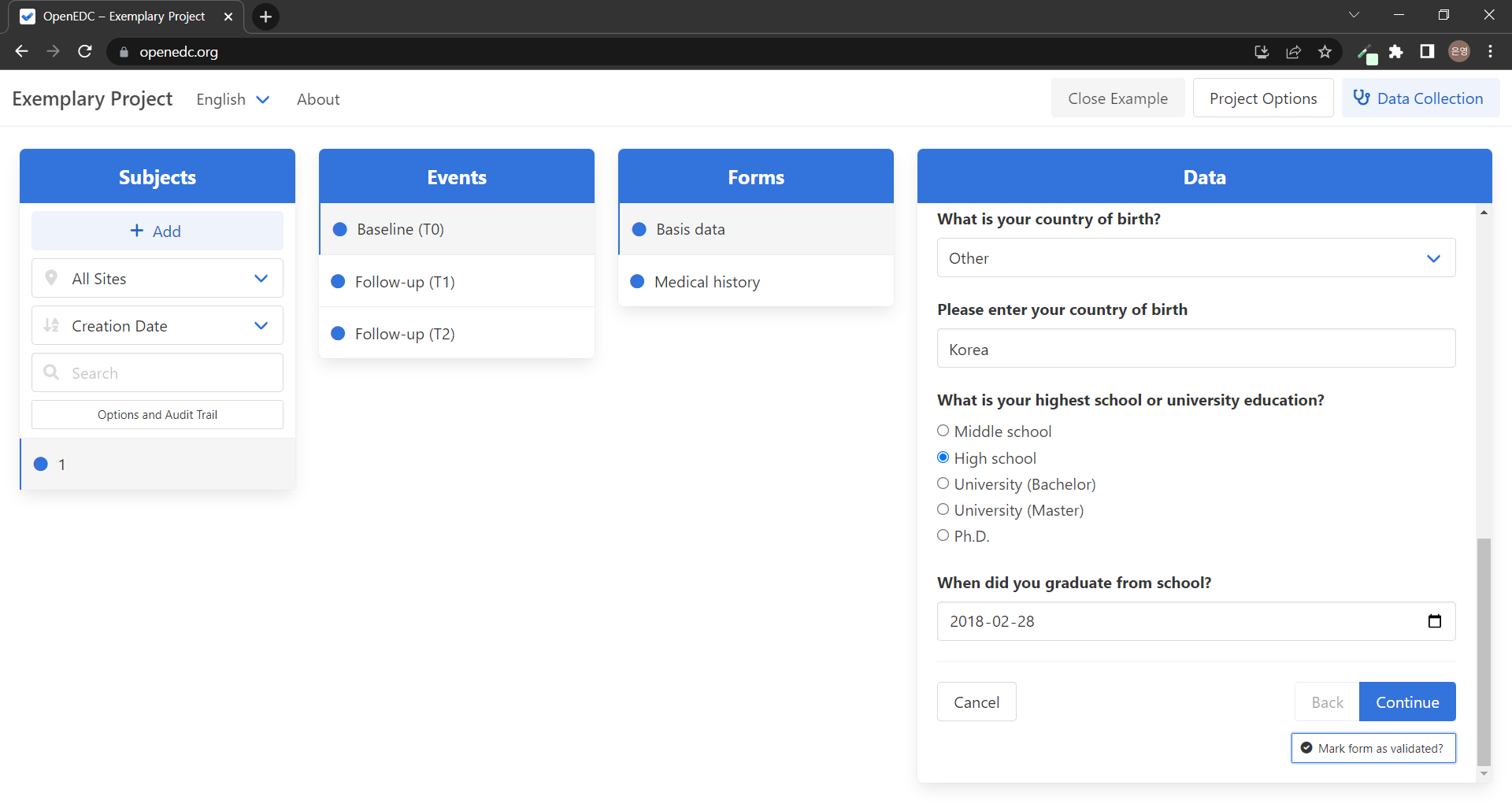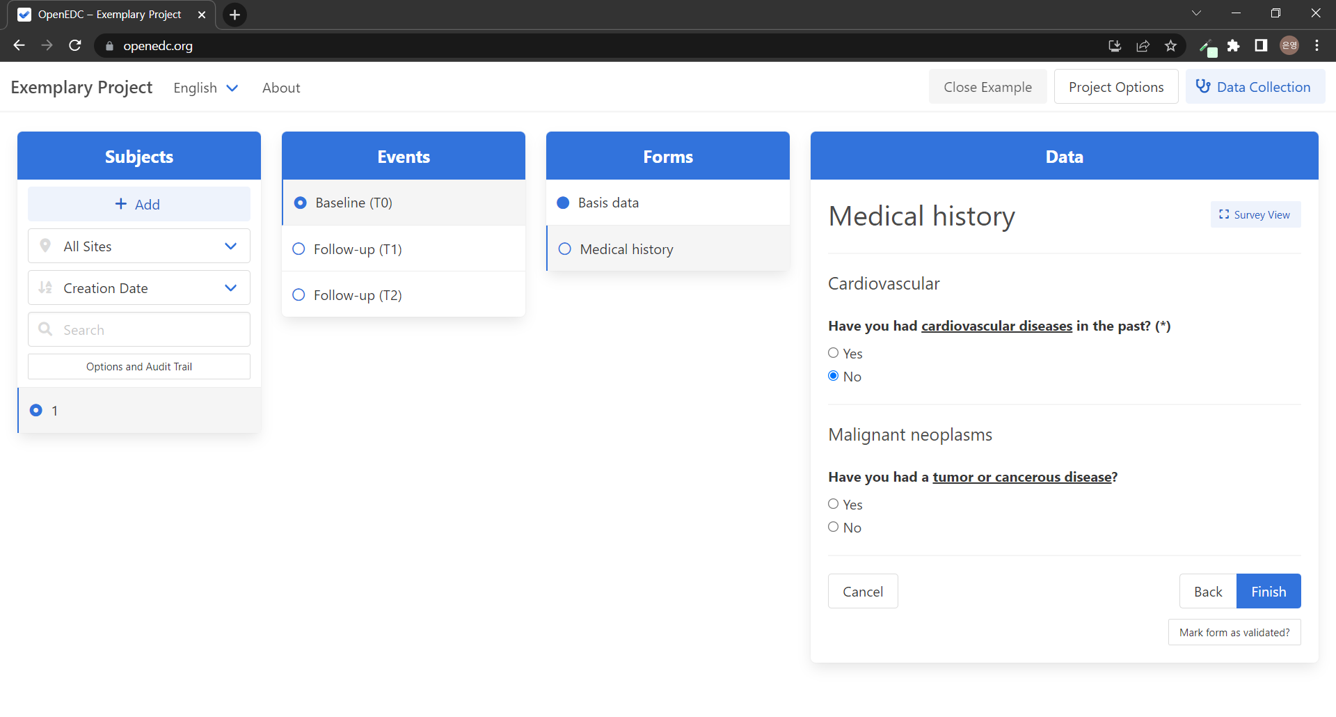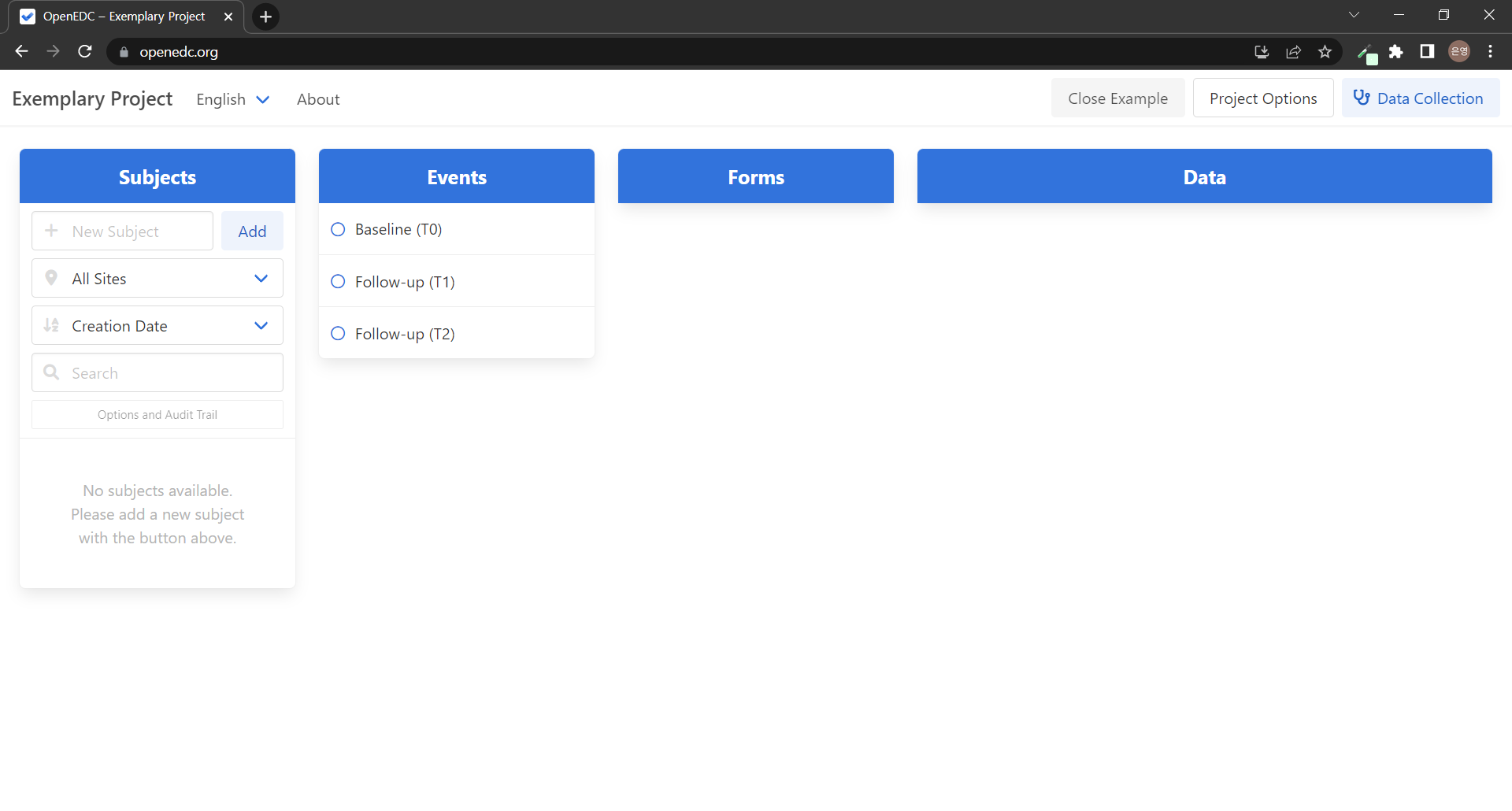 "์ด EDC(Open-Source Electronic Data Capture) ์์คํ ์ ์ฌ์ฉํ๋ฉด CDISC ODM-XML ํ์ค์ ๊ธฐ๋ฐํ ์์ ํ ์๋ฃ ์ฐ๊ตฌ ์คํฐ๋๋ฅผ ์ค๊ณํ๊ณ ์ํํ ์ ์์ต๋๋ค. ๋ชจ๋ ๋ฐ์ดํฐ๋ ๋ก์ปฌ ์ฅ์น์๋ง ์ฒ๋ฆฌ๋๊ณ ์ ์ฅ๋ฉ๋๋ค. ์ ํ์ ์ผ๋ก ์ฌ์ฉ์ ์์ ์ OpenEDC ์๋ฒ์ ์ฐ๊ฒฐํ์ฌ ์ฌ๋ฌ ์ฌ์ฉ์ ๋ฐ ์ฌ์ดํธ๋ก ๋ฆฌ์์น ์คํฐ๋๋ฅผ ๋ง๋ค ์ ์์ต๋๋ค. ๋น ํ๋ก์ ํธ์ ๊ฒฝ์ฐ ์ ํ๋ก์ ํธ๋ฅผ ์ ํํฉ๋๋ค. ์ปดํจํฐ์ CDISC ODM-XML ํ์ผ์ด ์๋ ๊ฒฝ์ฐ ์ด๊ธฐ๋ฅผ ๋๋ฅด์ญ์์ค. ์ด EDC ์์คํ ์ ์์ง ์ฌ์ฉํ์ง ์์ ๊ฒฝ์ฐ ์๋ฅผ ์ ํํ์ฌ ์์ ํ๋ก์ ํธ๋ฅผ ๋ก๋ํ๊ณ ๋ชจ๋ ๊ฒ์ด ์ด๋ป๊ฒ ์๋ํ๋์ง ํ์ธํ์ญ์์ค."