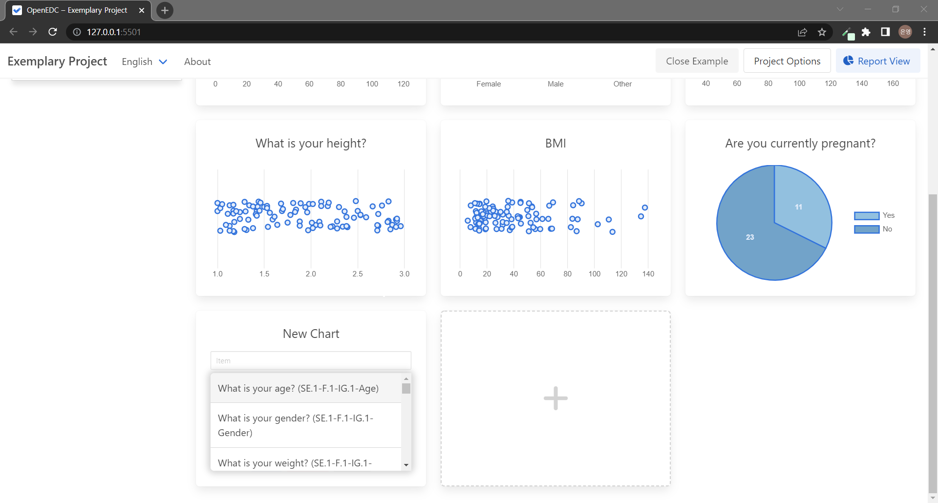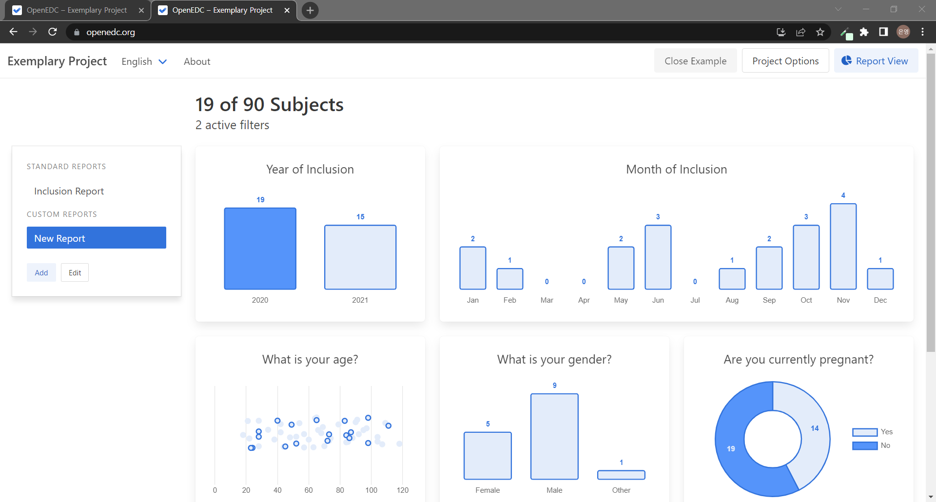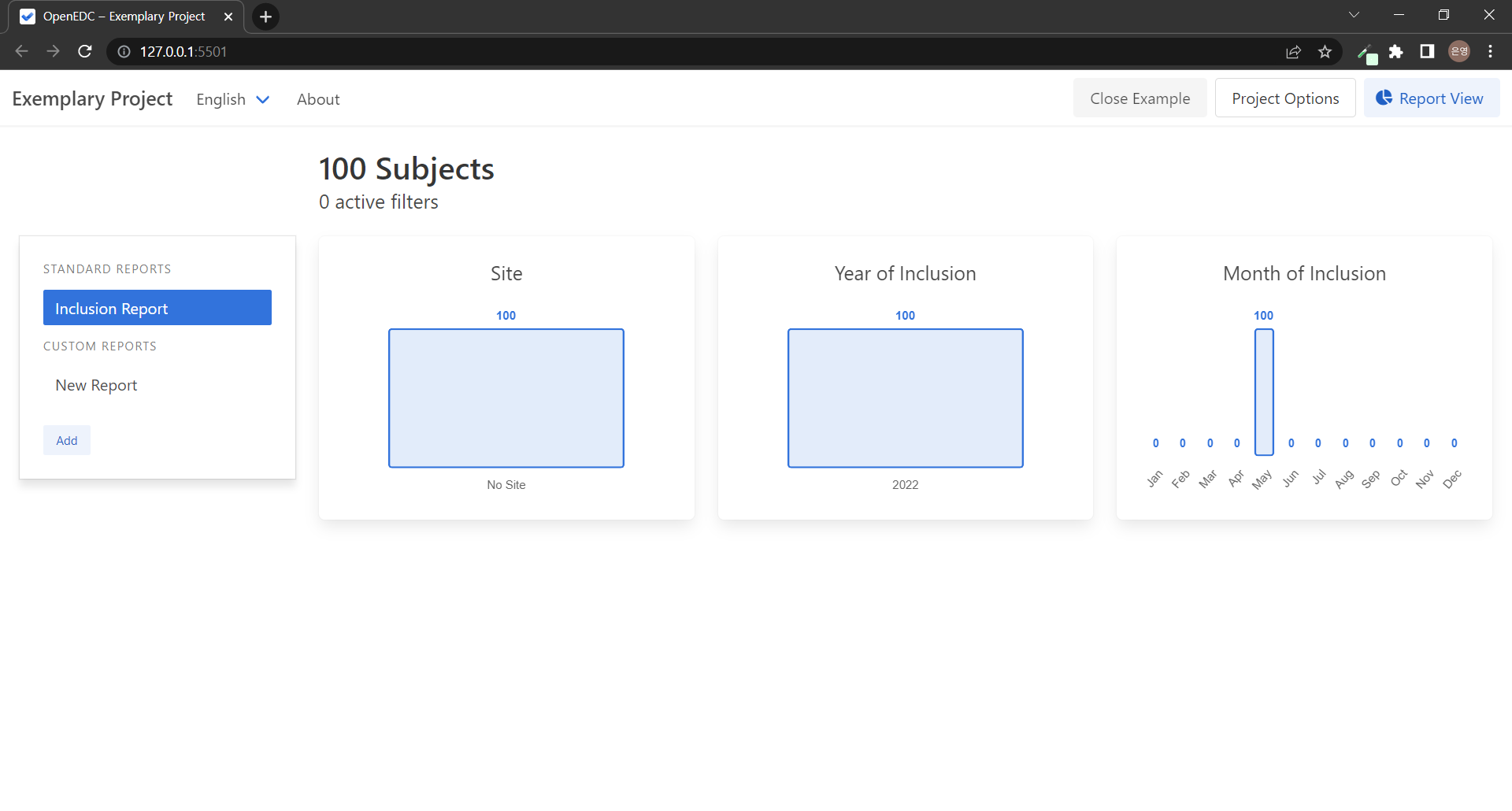์ฒ์ Report View ํ์ด์ง์ ๋ค์ด์ค๋ฉด ์ํ๋์์(subject) ์๊ฐ ์๋จ์ ์ ํ์๊ณ ํ์ค ๋ณด๊ณ ์์ธ Inclusion Report ๊ทธ๋ํ๋ค์ ๋ณผ ์ ์๋ค. ์ํ๋์์๋ค์ Site, Year of inclusion, Month of Inclusion๋ค์ ํ์ธํ ์ ์๋๋ฐ ์ง๊ธ ์ฐ๋ฆฌ ์ํ๋์์๋ค์ ๊ฒฝ์ฐ ๋ชจ๋ No Site์ด๊ณ 2022๋ 5์์ ๋ง๋ค์ด์ก์ผ๋ฏ๋ก ๋ชจ๋ ๊ฐ์ ํญ๋ชฉ ์์ ๋ค์ด๊ฐ๊ฒ ๋๋ค..! ์ง๋ฌธ์ ๋ฐ๋ฅธ ๋ค์ํ ๊ทธ๋ํ๋ค์ ๋ณด๊ธฐ ์ํด ์๋ก์ด ๋ณด๊ณ ์๋ฅผ ๋ง๋ค์ด๋ณด์! ๊ธฐ๋ณธ์ ์ผ๋ก ์ถ๊ฐ๋์ด์๋ New Report๋ฅผ ์ฌ์ฉํด๋ ๋๊ณ , Add ๋ฒํผ์ผ๋ก ์๋ก์ด ๋ณด๊ณ ์๋ฅผ ๋ง๋ค ์๋ ์๋ค.
