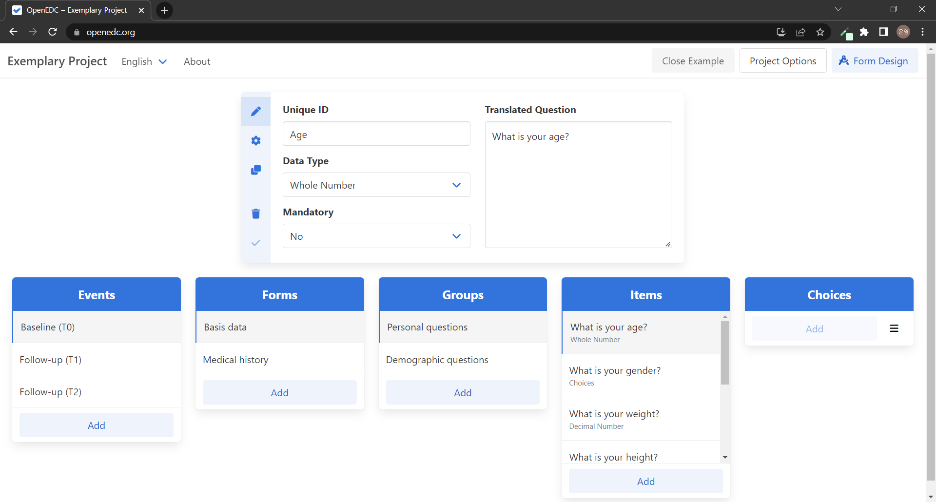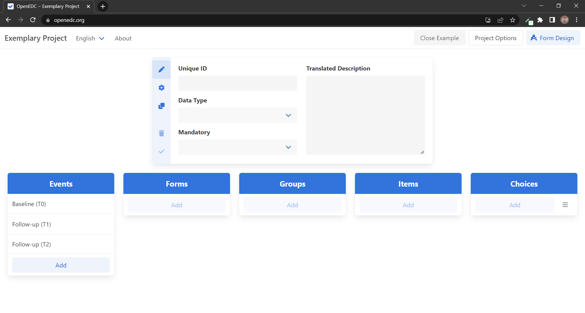 ํ๋ฉด ์ค์์ ๋ํ ์ผ ๋ณด๋์ ์๋ ๋ค์ฏ ๊ฐ์ง์ ์นดํ ๊ณ ๋ฆฌ๋ฅผ ํ์ธํ ์ ์๋ค. ๋ค์ฏ ๊ฐ์ง ์นดํ ๊ณ ๋ฆฌ๋ ๊ฐ๊ฐ Events, Forms, Groups, Items, Choices๋ก ODM ๋ชจ๋ธ์ ๊ตฌ์ฑ ์์์ ํฌํจ๋๋ ๊ฒ๋ค์ด๋ค. ์ฌ๊ธฐ์ ODM ๋ชจ๋ธ์ ๊ตฌ์ฑ ์์๋ ๋ค์๊ณผ ๊ฐ๋ค.