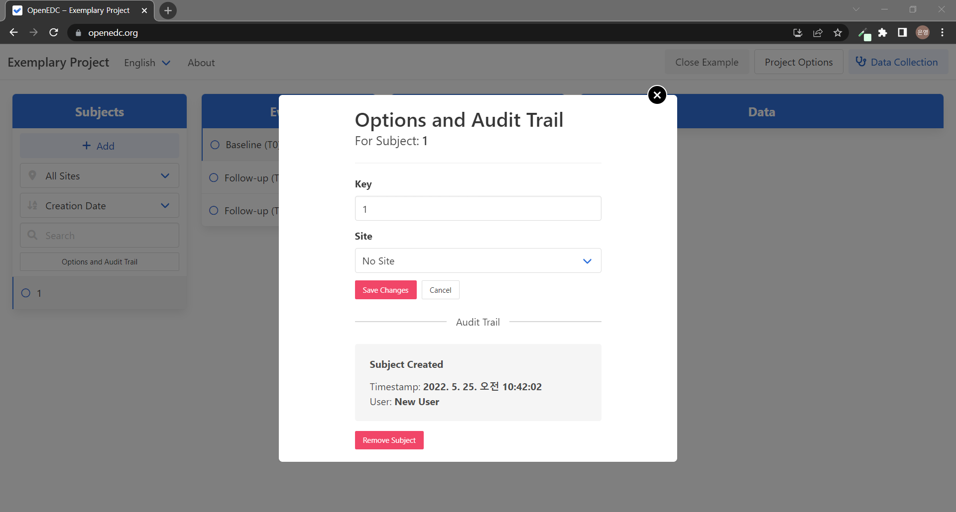 1์ด๋ผ๋ ์๋ณํค๋ฅผ ๊ฐ์ง ์ํ๋์์๊ฐ ์ถ๊ฐ๋์๊ณ ํด๋ฆญํ๋ฉด Options and Audit Trail ๋ฒํผ์ด ํ์ฑํ๋๋ค. ๋ฒํผ์ ๋๋ฅด๋ฉด ๋ค์๊ณผ ๊ฐ์ ๋ชจ๋ฌ์ด ๋จ๋๋ฐ ์ํ๋์์์ ์๋ณํค์ ์ฌ์ดํธ ์ ๋ณด๋ฅผ ์์ ํ๊ฑฐ๋ ์์ฑ์ผ์ ํ์ธํ๊ฑฐ๋ ์ํ๋์์ ์ ๋ณด๋ฅผ ์ญ์ ํ ์ ์๋ ๊ฒ ๊ฐ๋ค!