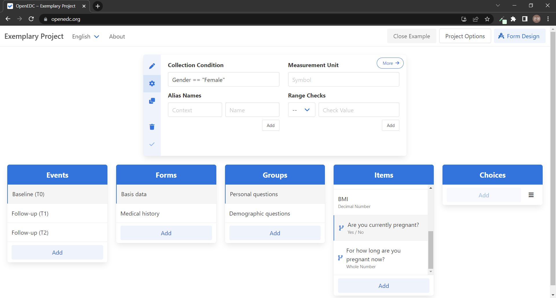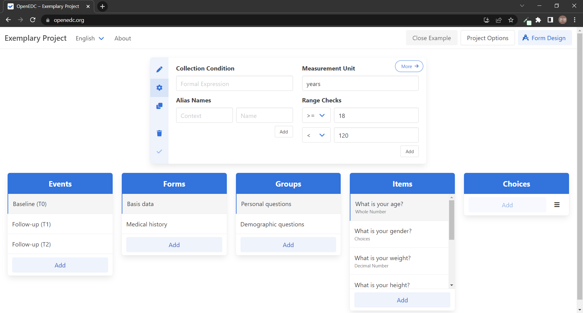 ์ง๋ฌธ(Item)์ ์๋ต ๋ฐ์ดํฐ ํ์์ด Choice(์ ํ)์ธ ๊ฒฝ์ฐ ํด๋น ์ง๋ฌธ์ Choices ์นดํ ๊ณ ๋ฆฌ์ Add ๋ฒํผ์ด ํ์ฑํ๋๋ฉฐ ์ ํ์ง๋ฅผ ์ถ๊ฐํ ์ ์๋ค. ์ถ๊ฐํ Choice๋ ์ฌํ๊น์ง์ ๋ค๋ฅด๊ฒ Unique ID๊ฐ ์๋ Coded Value๋ฅผ ์ค์ ํ๋ค. ๋ฌด์์ด ๋ค๋ฅธ ์ ์ธ์ง ์์ง ์ดํด๊ฐ ๊ฐ์ง ์๋๋ค... ๋จ์ ์ฉ์ด์ ์ฐจ์ด์ธ๊ฐ? Data Type๊ณผ Mandatory ๋๋กญ๋ค์ด์ ๊ฒฝ์ฐ ๋ค์ ๋นํ์ฑํ๋๋ค.