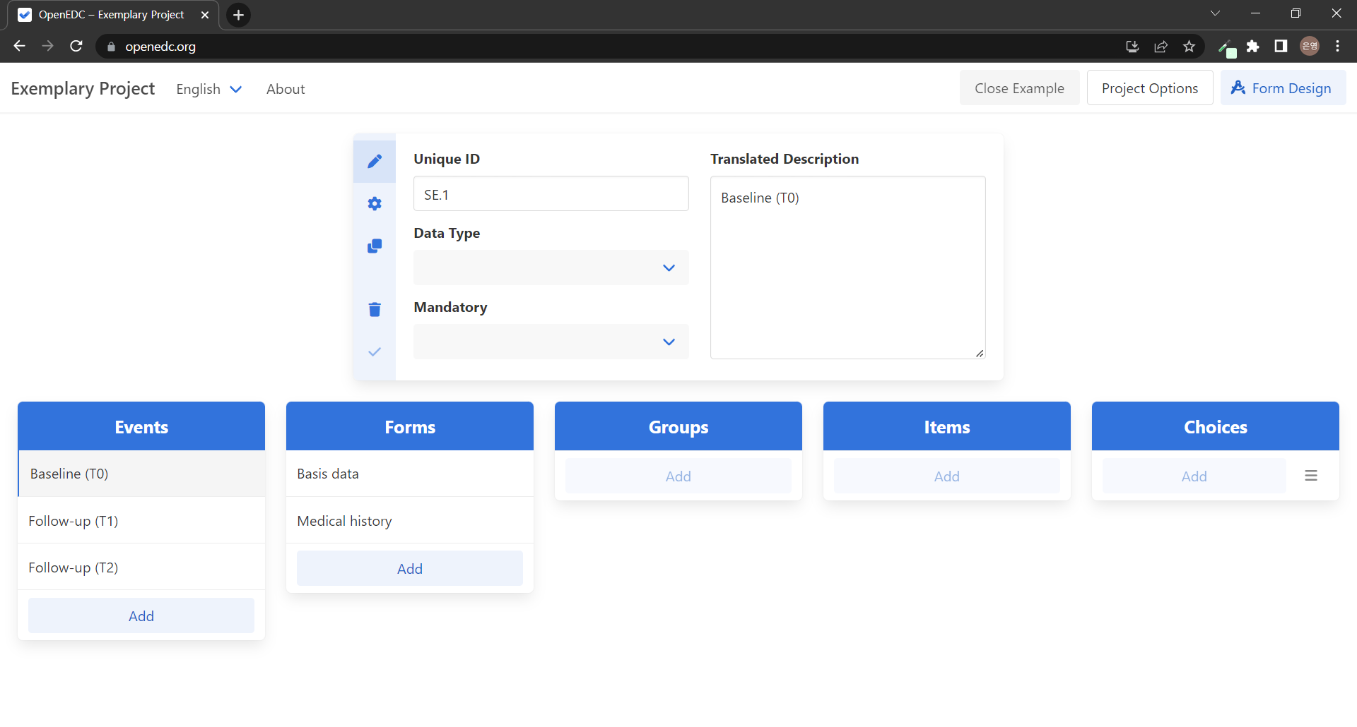 Events ์ค ํ๋๋ฅผ ์ ํํ๋ฉด ๋ํ ์ผ ๋ณด๋์ Unique ID์ Translated Description์ด ๋ํ๋๊ณ ํ์ Forms๋ค์ ๋ณผ ์ ์๋ค. Unique ID์ธ SE.1์ ์๋ง Special Event์ ์ค์๋ง์ธ ๊ฒ ๊ฐ๊ณ Baseline(T0)์ ์๋ฏธ๋ฅผ ๋ชจ๋ฅด๊ฒ ์ด์.. ๋์ค์ ์ค๋ช ์ ๋ฃ๊ณ ์ ์ด์ผ๊ฒ ๋ค.