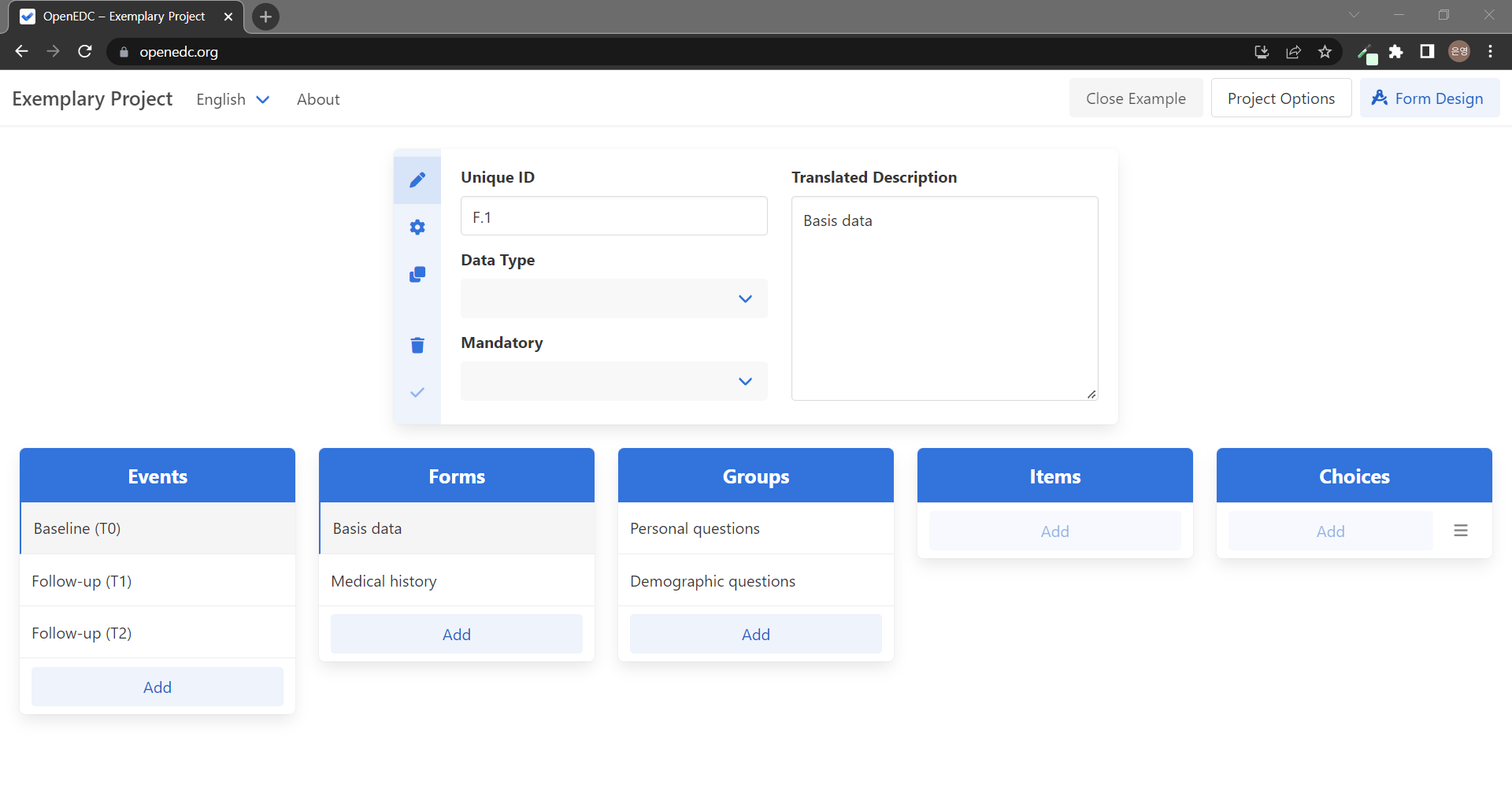 Forms๋ ๋ง์ฐฌ๊ฐ์ง๋ก ์ ํ ์ Unique ID์ Translated Description์ด ๋ํ๋๊ณ ํ์ Item Groups๋ฅผ ๋ณผ ์ ์๋ค. Baseline Event์ Basis data(๊ธฐ๋ณธ ์ ๋ณด) Form๊ณผ Medical history(๋ณ๋ ฅ) Form์ด ํฌํจ๋์ด ์๋ค.