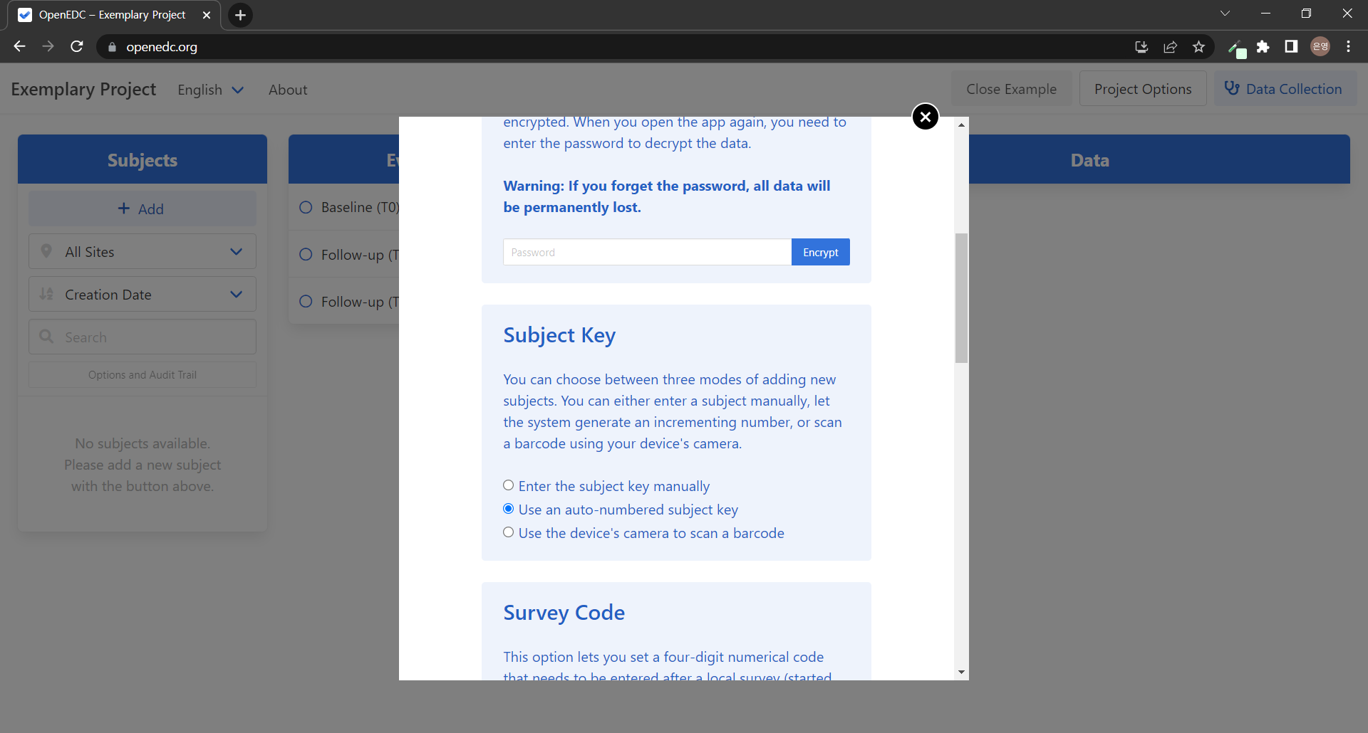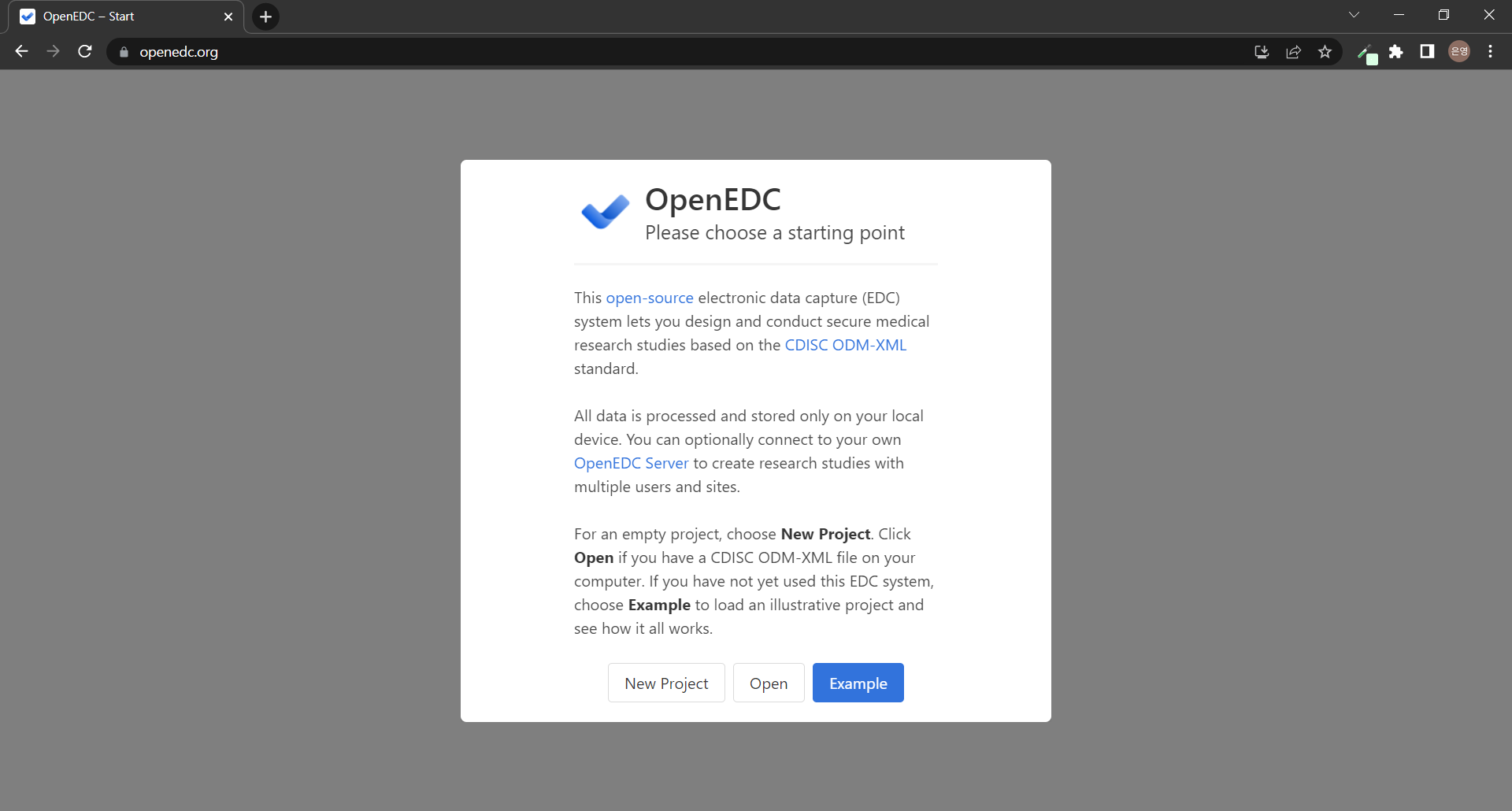 OpenEDC์ ์์ ํ์ด์ง๋ ํฐ ๋ฐฐ๊ฒฝ ์์ ๋ชจ๋ฌ๋ก ์์ํ๋ค. ๊ตณ์ด..? ์ค๋ฌ์ด ํ๋ฉด ๊ตฌ์ฑ์ด๋ผ ์ ์ด๋ ๊ฒ ํ๋์ง ์ฐพ์๋ณด๊ณ ํฐ ๋ฌธ์ ๊ฐ ์๋ค๋ฉด ์ ์ฒด ํ๋ฉด์ ์ฌ์ฉํ๋ฉด ์ข์ ๊ฒ ๊ฐ๋ค! ๋ชจ๋ฌ ์์ ๋ด์ฉ์ ๋ฒ์ญํด๋ณด์๋ฉด,
