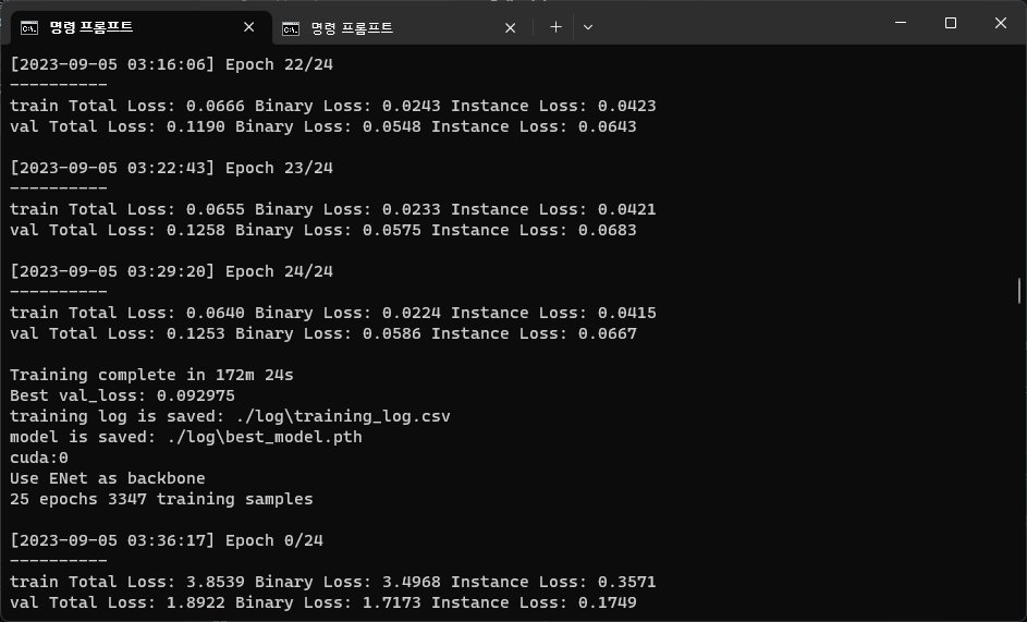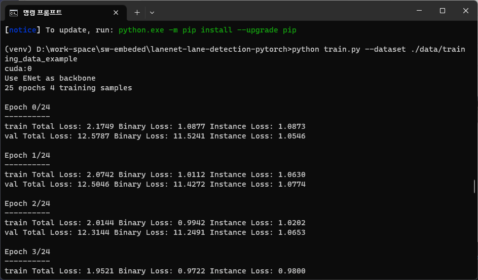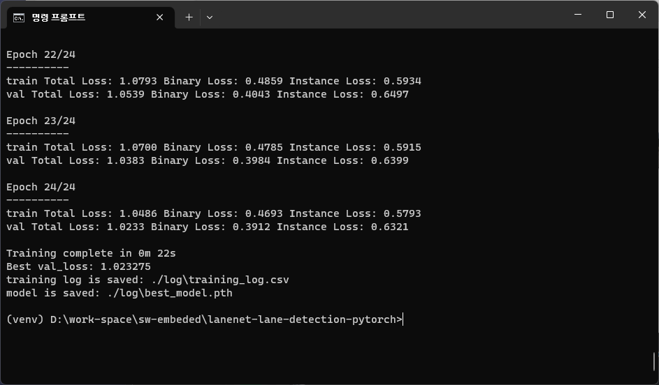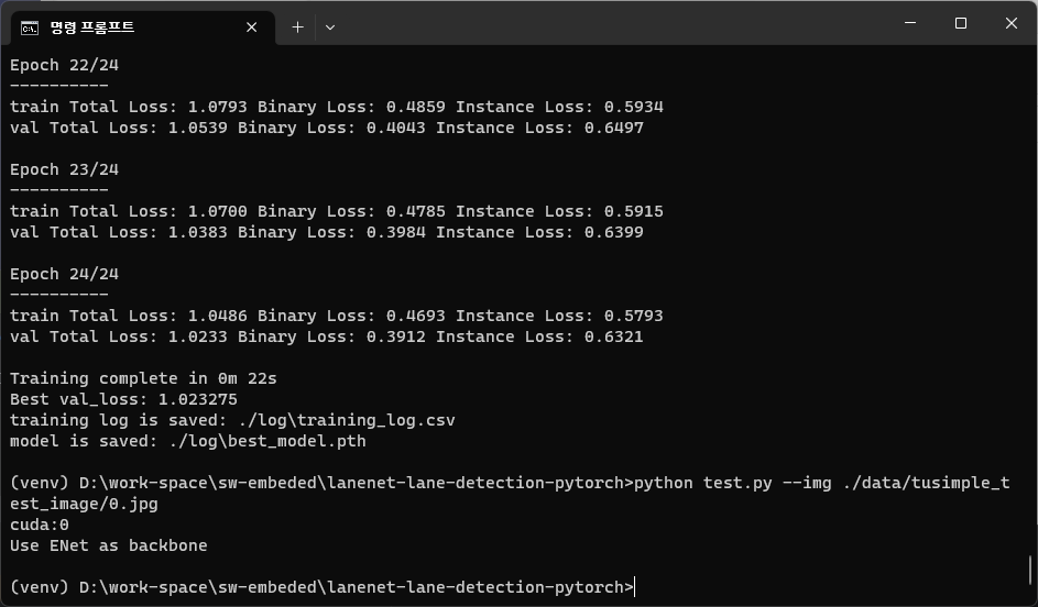 python train.py --dataset ./tusimpledataset/TUSimple/train_set/training --loss_type CrossEntropyLoss ์ด 166m, ํ๊ท ์ ์ผ๋ก 7๋ถ์ฉ,