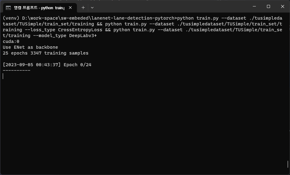 python train.py --dataset ./tusimpledataset/TUSimple/train_set/training --model_type DeepLabv3+ ์ด 1328m, ํ๊ท ์ ์ผ๋ก 53์ฉ ๊ฑธ๋ ธ์.